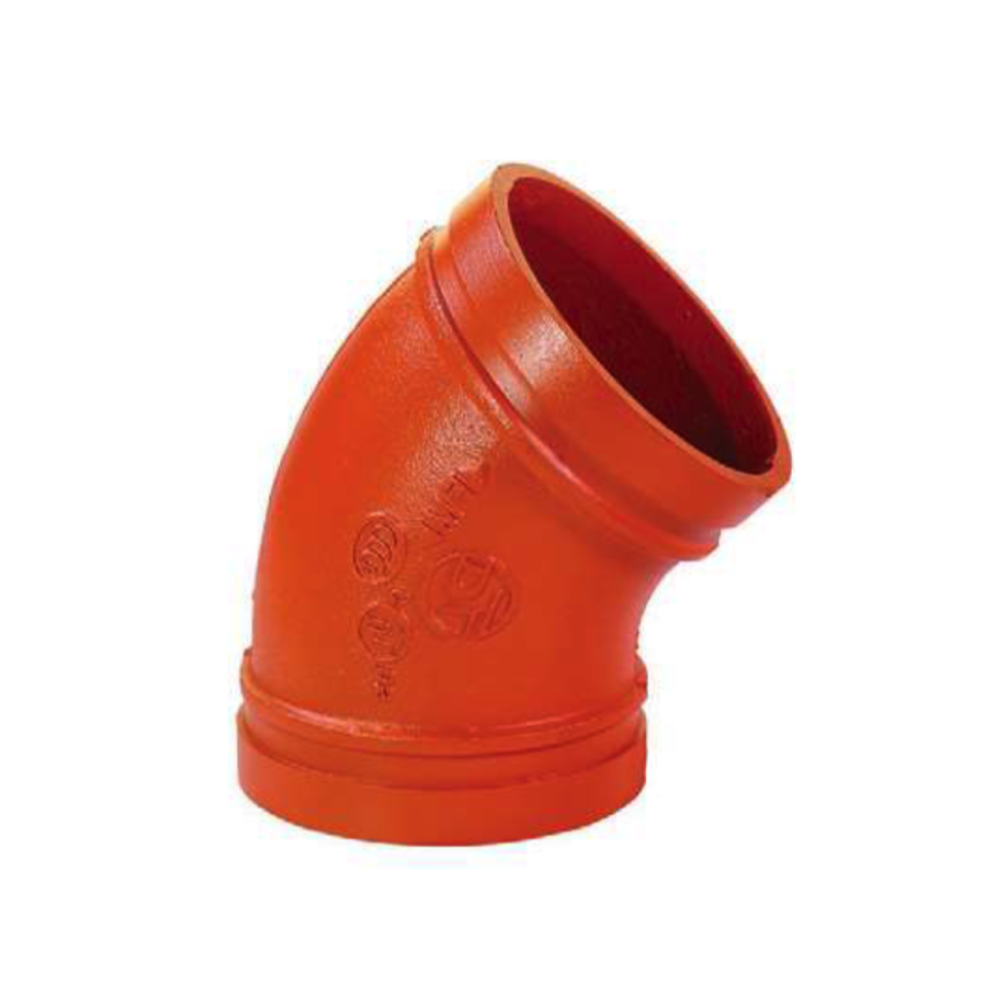 45˚ grooved elbow is a fitting designed to change the direction of piping systems by 45 degrees, providing flexibility and efficiency in directing pipes within industrial facilities. It ensures secure and leak-proof connections, enhancing the overall reliability and longevity of the system. Grooved pipe systems offer easy assembly and disassembly, allowing for quick and practical installation, minimize the risk of leaks due to high-quality materials, reduce vibrations and noise caused by fluid flow, and have a wide range of applications across various industries. They demonstrate high durability under challenging operating conditions and are long-lasting, offering cost-effectiveness by reducing maintenance and repair costs in the long term. Additionally, their modular design allows systems to be easily customized and expanded according to needs. Grooved connection systems are widely used in the chemical and petrochemical industries, power generation facilities, construction and infrastructure projects, fire suppression water systems, HVAC (Heating, Ventilation, and Air Conditioning) systems, and oil and gas pipelines.