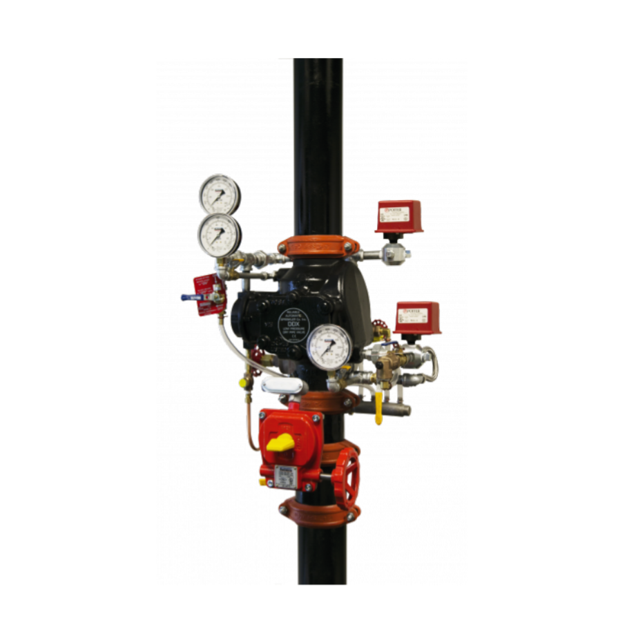Dry Alarm Valve The dry pipe sprinkler system is used in unheated and frost-prone areas to prevent damage to the water and sprinklers in the fire suppression system. In this system, the pipes are filled with pressurized air or inert gas. When a fire occurs and the sprinklers activate, the air pressure drops, causing the dry alarm valve clapper to open, allowing water to flow and suppress the fire. The dry alarm valve is preferred in areas at risk of freezing, such as parking garages, warehouses, attic spaces, workshops, manufacturing facilities, hotels, waste collection centers, and shopping malls. The upper part of the valve is pressurized with air or gas, while the lower part is pressurized with water. The time for water to discharge from the most distant point in the system should not exceed 60 seconds.